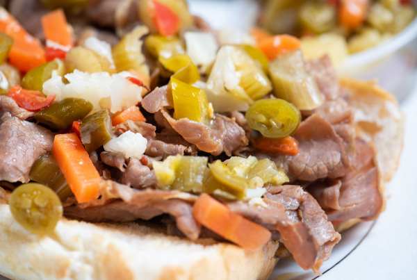 Sliced beef slowly roasted, mixed with Sweet Baby Ray’s BBQ sauce. Served with fresh baked french bread. (3 lb. minimum) Sweet or Hot peppers $2.95